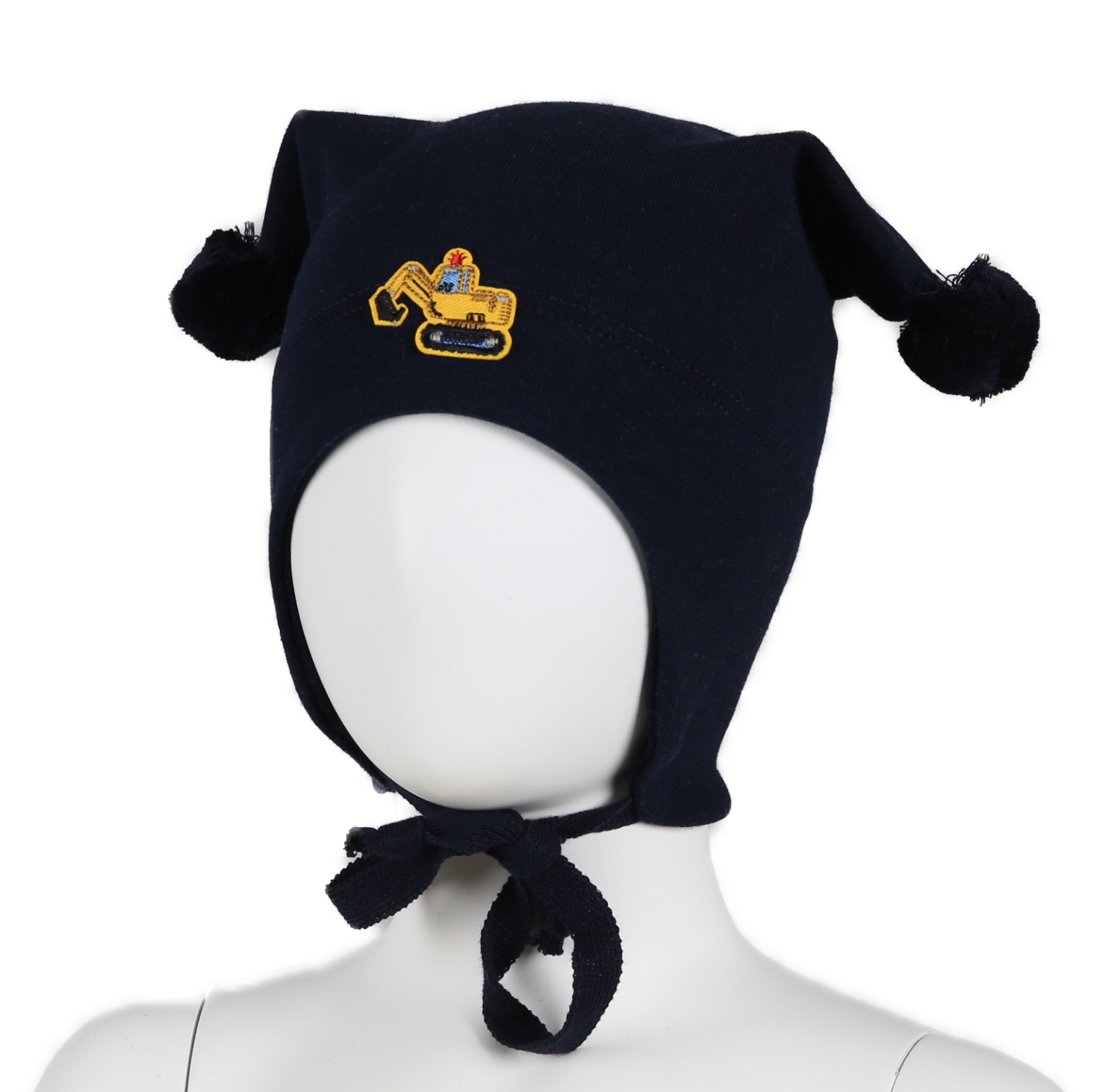 Lue med knyting og dusker fra Kivat. Luen har vindstopper ved ørene og sitter godt på hodet uten å skli ned i øynene, og bort fra ørene.