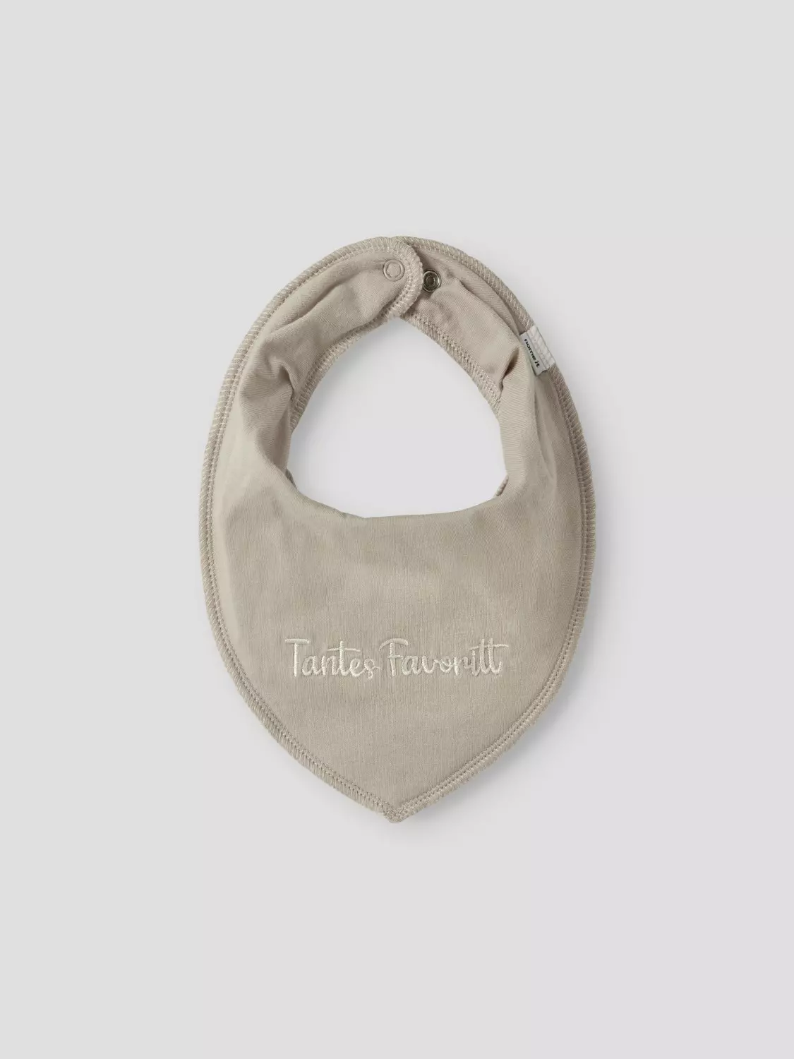 Smekke Scarf Bib fra Name It. Smekken har et brodert motiv hvor det står «Tantes favoritt». Smekken er i str onesize