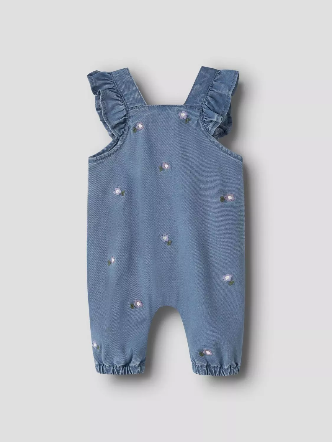 Søt denim heldress til baby jente fra Name It. Suiten har elastiske kanter, knappelukking i front og trykknapper mellom bena. Buksen har rysjedetaljer og små broderte blomster.